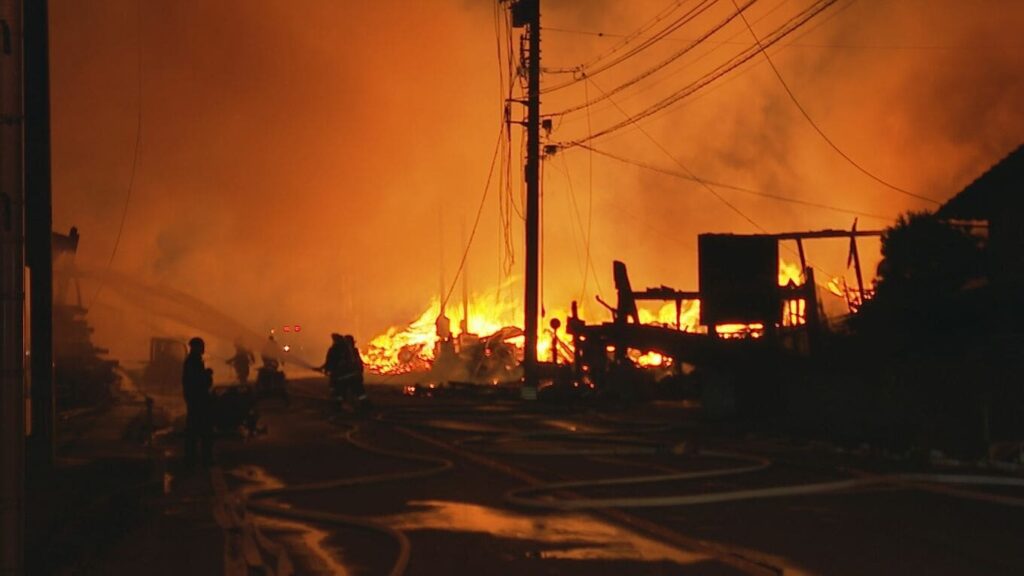 火元とみられる製材所は激しく燃え、周囲の建物にも火が広がる事態となりました。